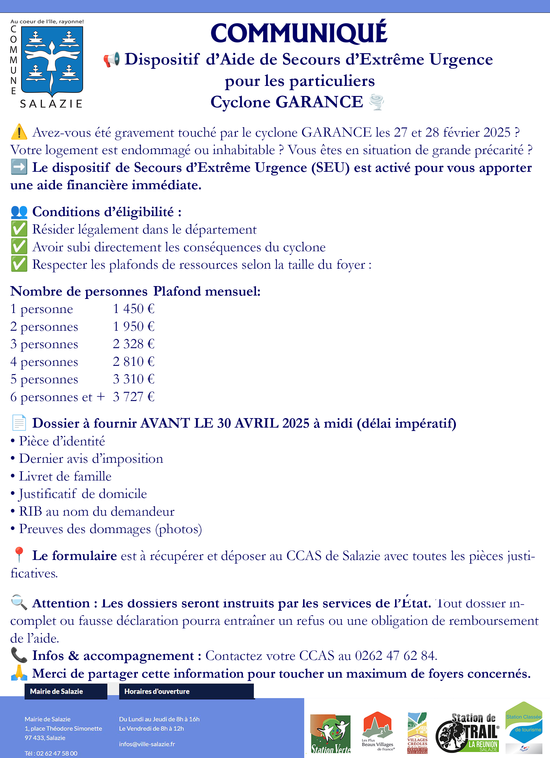 Dispositif d’Aide de Secours d’Extrême Urgence pour les particuliers Cyclone GARANCE